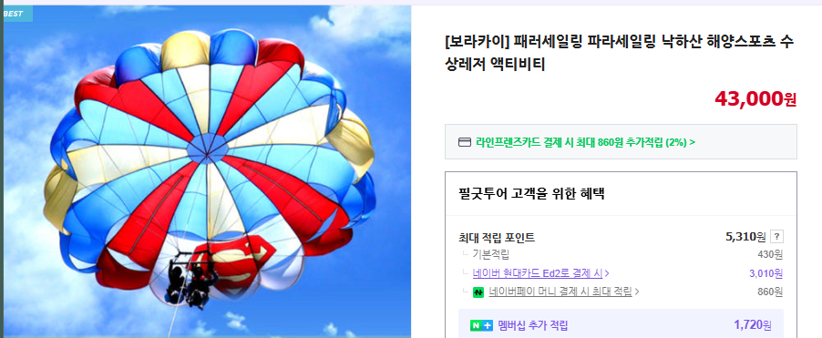 - 오후: 파라세일링/헬멧다이빙/스탠드업패들 중 선택